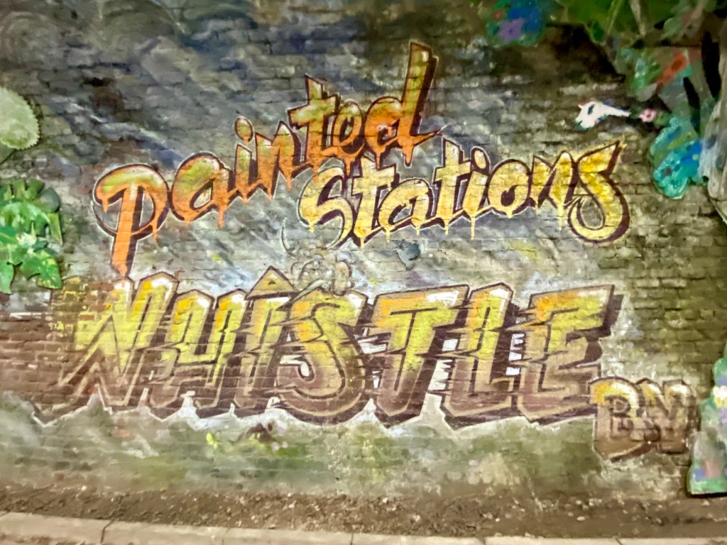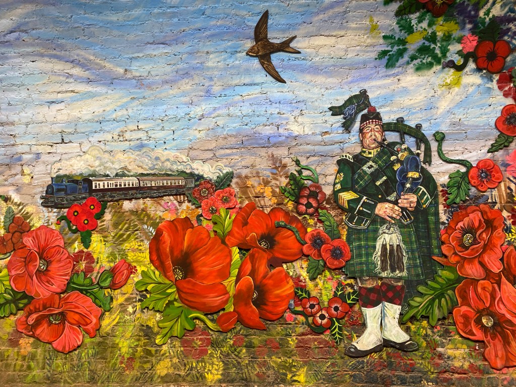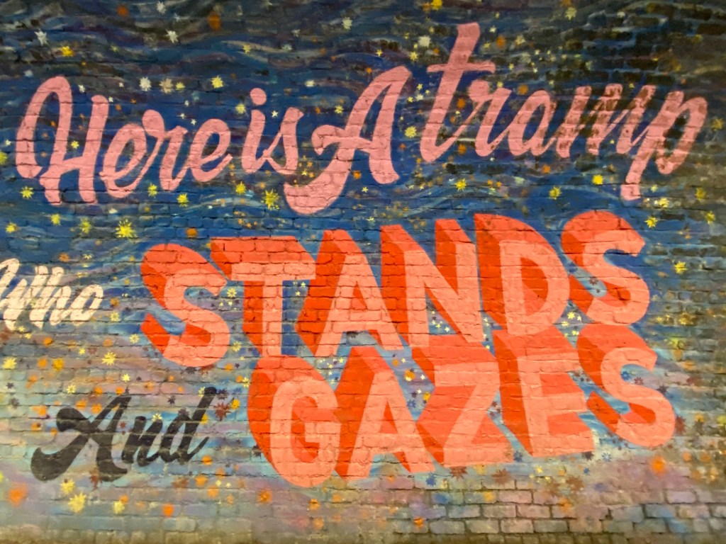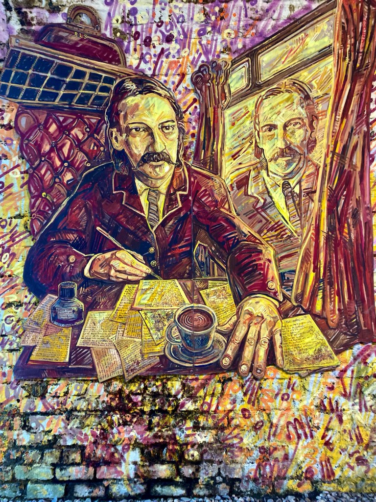 Just inside one end of the tunnel is this wonderful artwork depicting Robert Louis Stevenson in a railway carriage, writing the very poem that inspired the entire mural: