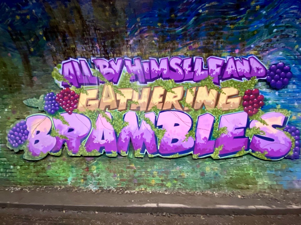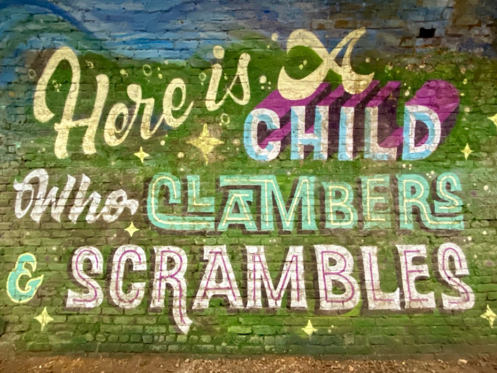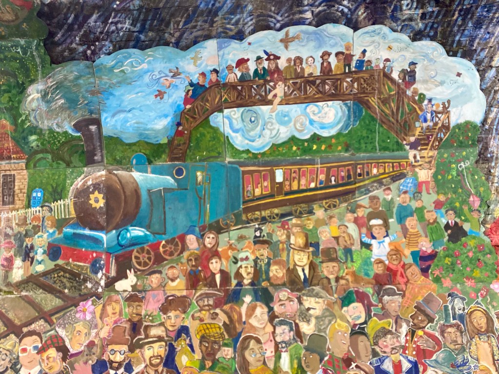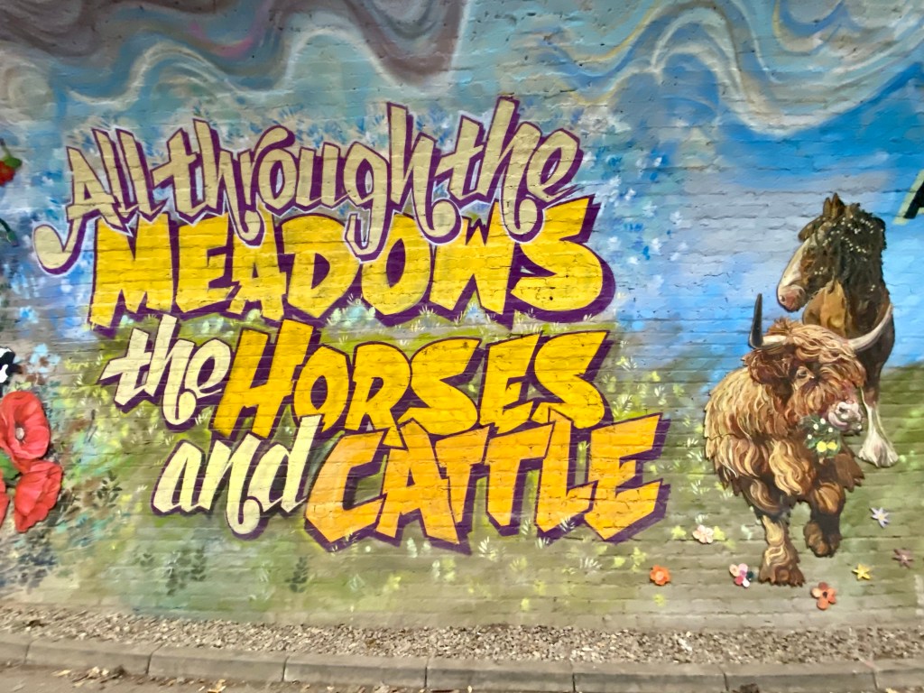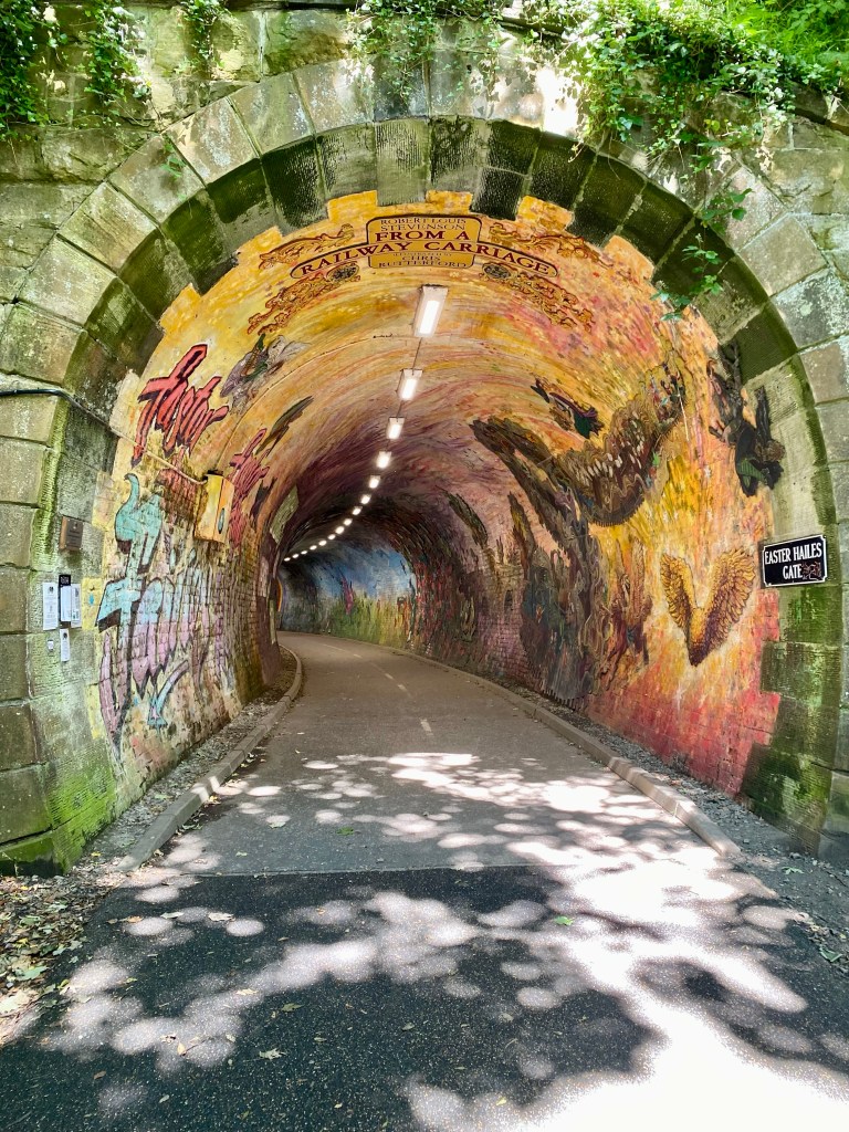 With the expansion of bus and tram services to Colinton, the use of train services to Colinton declined over time and passenger services stopped altogether in 1943 (though freight services continued until 1967). By 2017 Colinton Tunnel had fallen into disrepair and had become a dark and somewhat scary place to walk through. Eventually a number of Colinton residents began to consider what could be done to make the tunnel a more attractive, safer space, one that might encourage visitors to Colinton – and hopefully benefit local shops and businesses in the Village. Lighting was added to the tunnel and it was decided that the entire length of it should be decorated with a mural. A design concept crystallised around Robert Louis Stevenson’s ‘From a Railway Carriage’, one of the wonderful little poems in his volume A Child’s Garden of Verses.