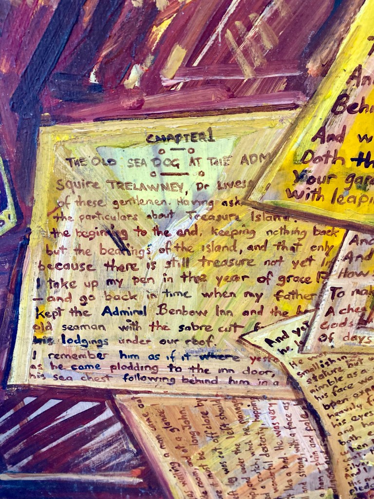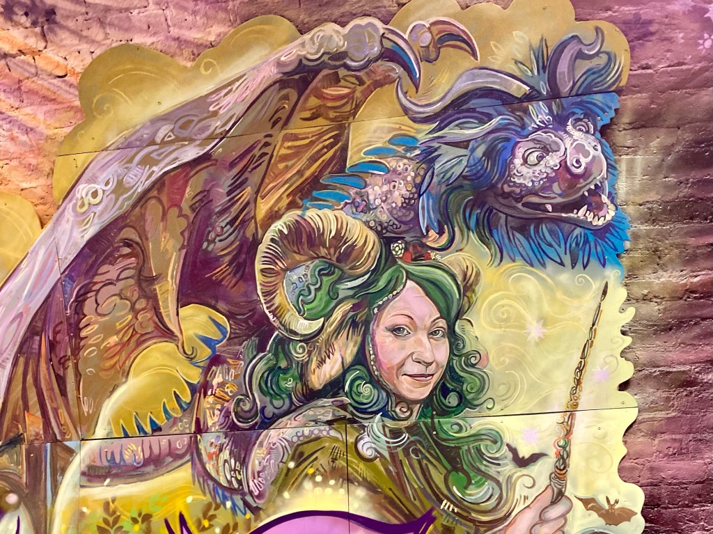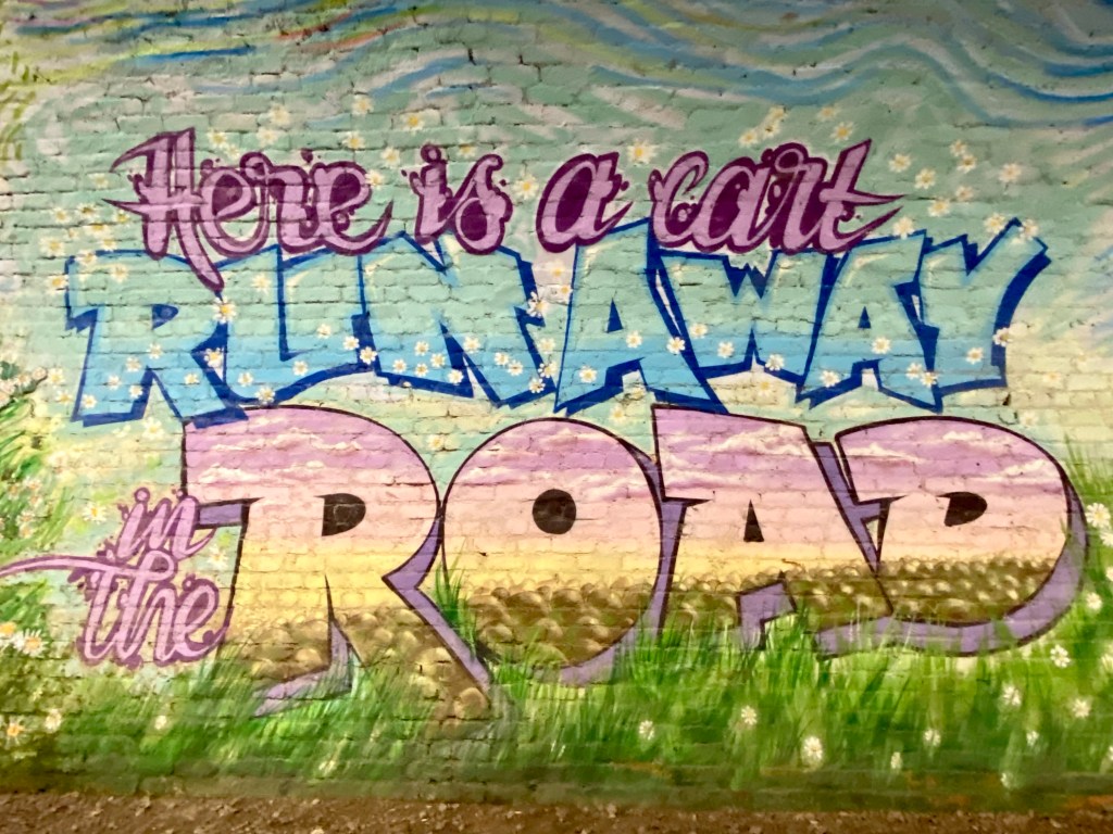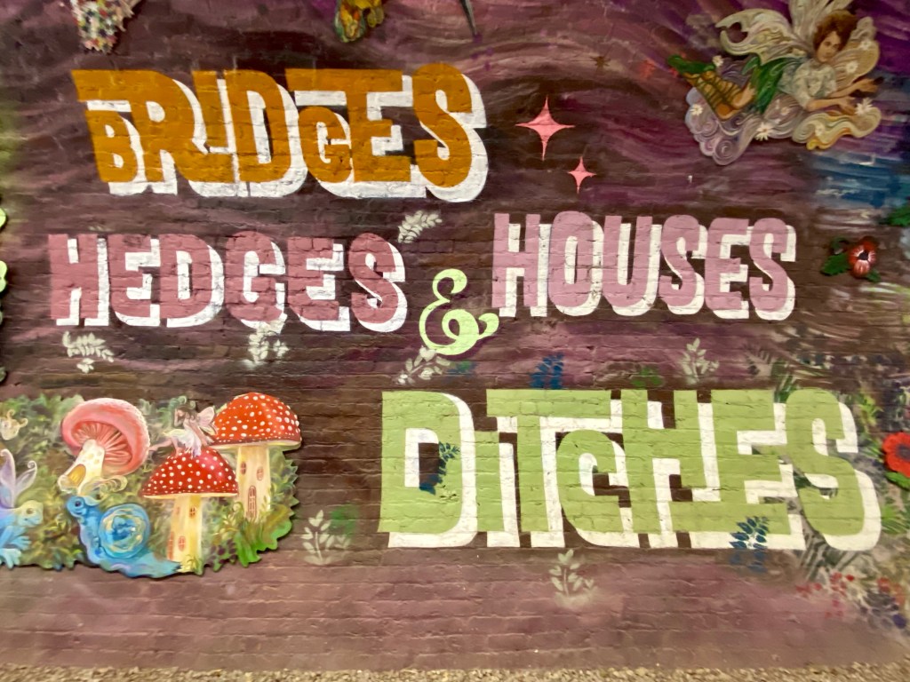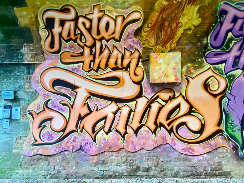 With the expansion of bus and tram services to Colinton, the use of train services to Colinton declined over time and passenger services stopped altogether in 1943 (though freight services continued until 1967). By 2017 Colinton Tunnel had fallen into disrepair and had become a dark and somewhat scary place to walk through. Eventually a number of Colinton residents began to consider what could be done to make the tunnel a more attractive, safer space, one that might encourage visitors to Colinton – and hopefully benefit local shops and businesses in the Village. Lighting was added to the tunnel and it was decided that the entire length of it should be decorated with a mural. A design concept crystallised around Robert Louis Stevenson’s ‘From a Railway Carriage’, one of the wonderful little poems in his volume A Child’s Garden of Verses.