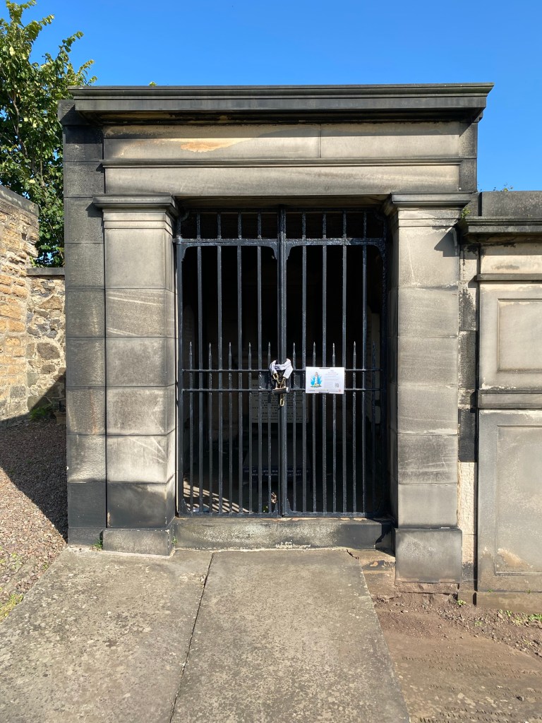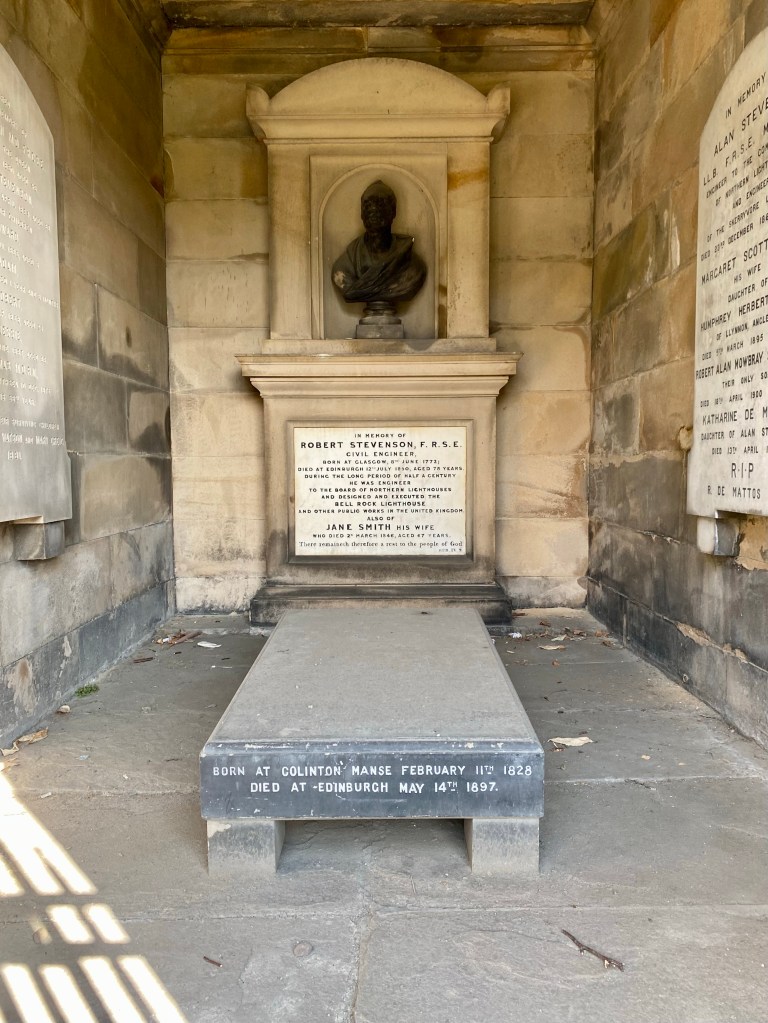 Other family members buried in the tomb include his father, Robert Stevenson, who designed the iconic Bell Rock Lighthouse, and his brother, Alan Stevenson, who designed Skerryvore Lighthouse, the tallest lighthouse in Scotland. Margaret Stevenson, Thomas’s wife, was also buried here when she died on May 14th 1897. Their memorial stone is the one lying on the ground. Unfortunately, the stone has not aged well and is difficult to read.