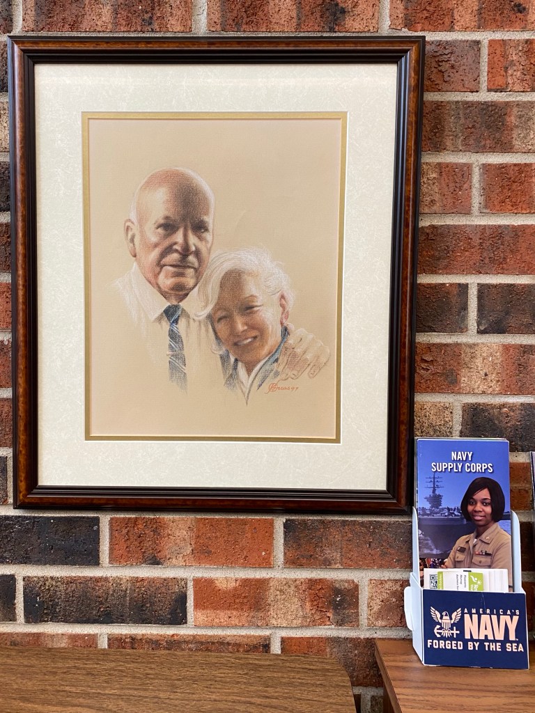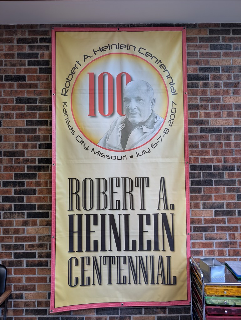 Gwyneth and I headed straight into the Heinlein room, which at first glance looked just as I remembered from my first visit. I asked her to snap a few photos of me—one by the large poster commemorating the Heinlein Centennial event from 2007 (which took place in Kansas City, Missouri), and another beside a beautiful piece of artwork by Frank Kelly Freas that portrays Heinlein and his wife, Virginia.