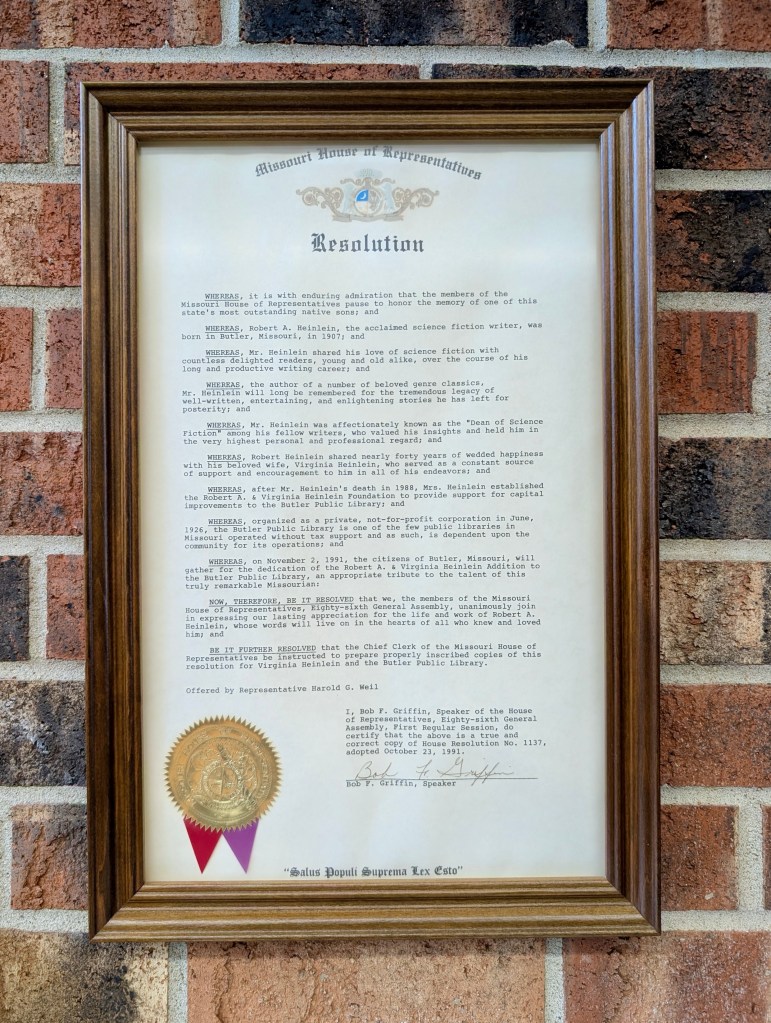 Lying on a shelf beneath a framed Resolution by the Missouri House of Representatives (expressing their lasting appreciation for the life and work of Heinlein) …