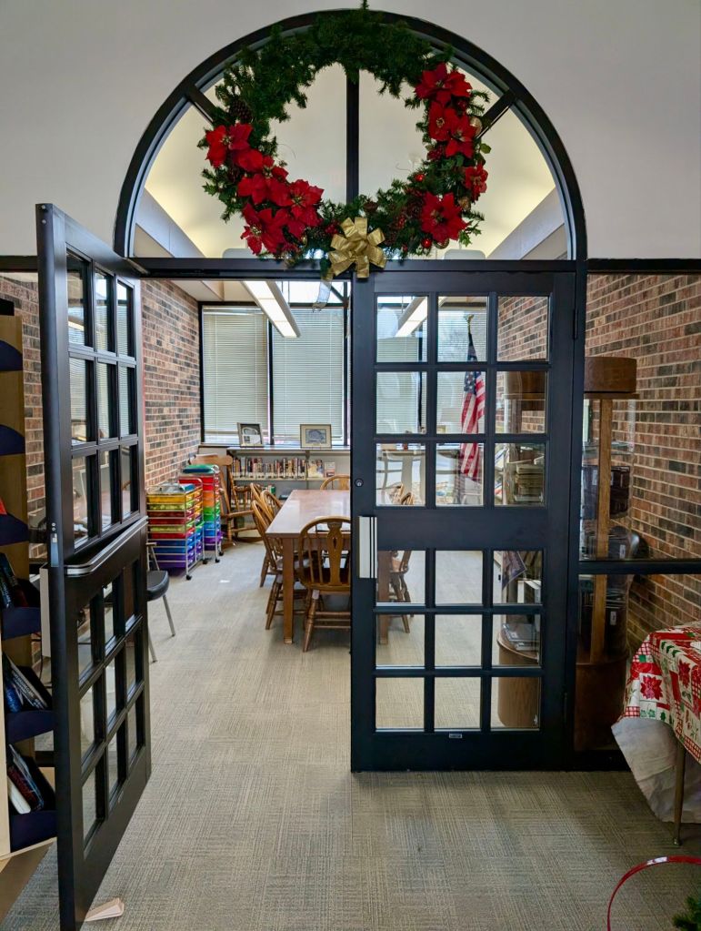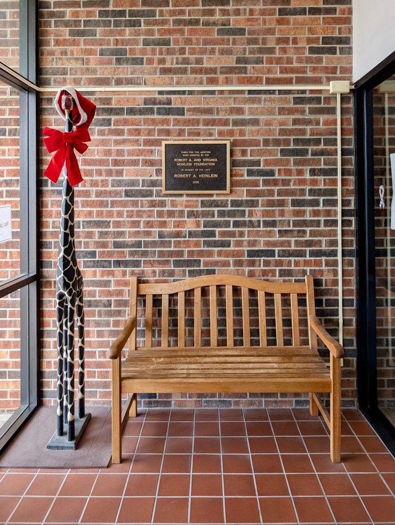 The first time I visited Butler Public Library was on Christmas Eve, 2021, almost exactly three years earlier. Just as it had been then, the library was decked out for the holiday season—but this time there was a quirky twist. Right by the entrance stood a giraffe sculpture sporting a Santa hat. Clearly, the library had decided to skip the usual holiday suspects like reindeer and snowmen for something a bit more unexpected!