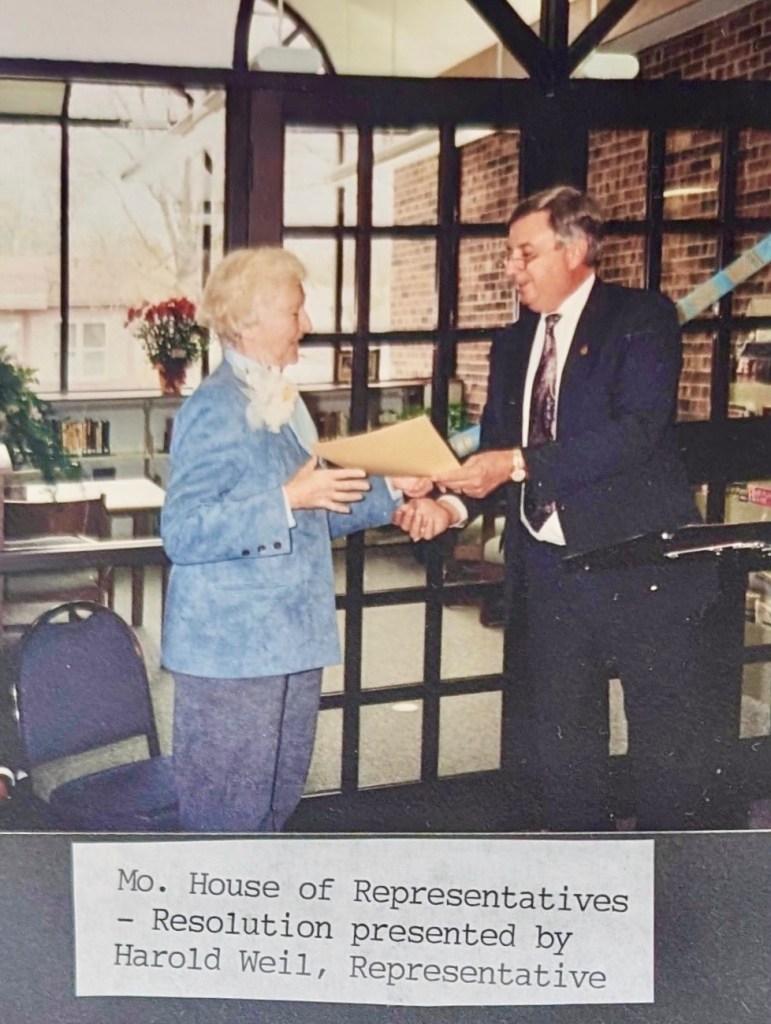 State Senator Harold Caskey and Representative Harold Weil presented Mrs. Heinlein with resolutions from their respective branches, while Chamber of Commerce President Cheryl Morrow gave her a commemorative plaque.